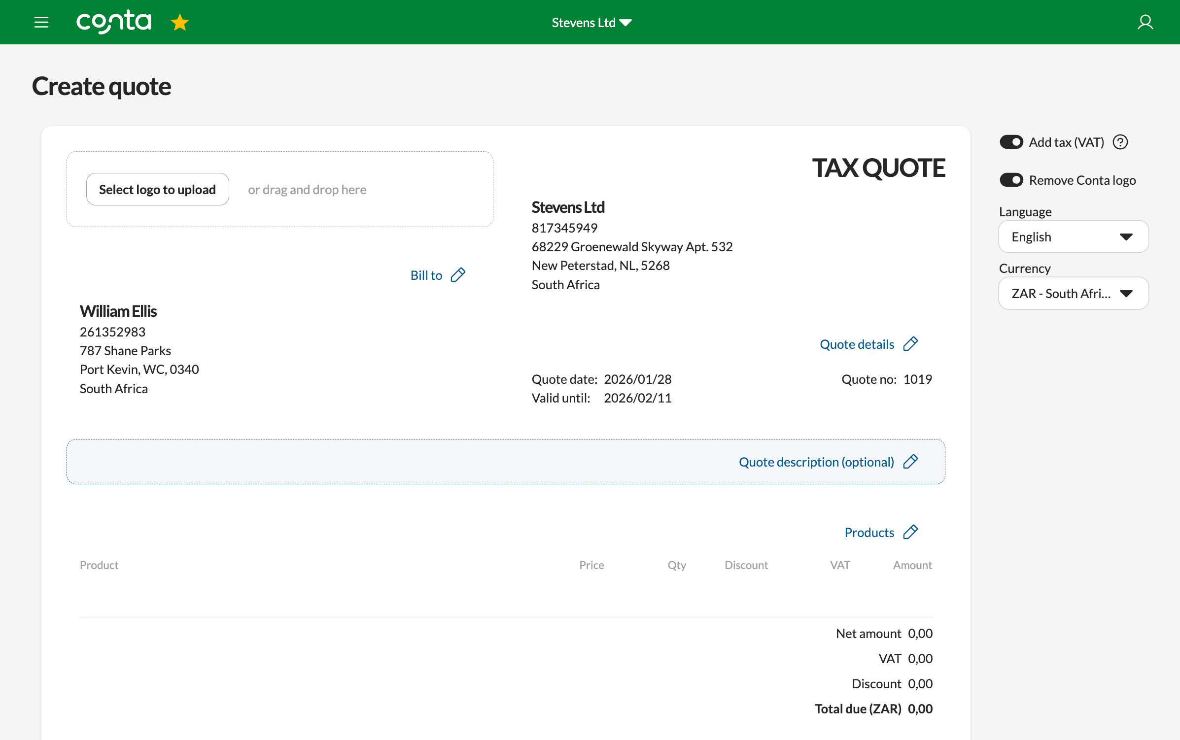 The Create quote function lets you deliver a quote to your client and keep track of whether it has been accepted or declined. Once a quote is accepted, it can be converted directly into an invoice.