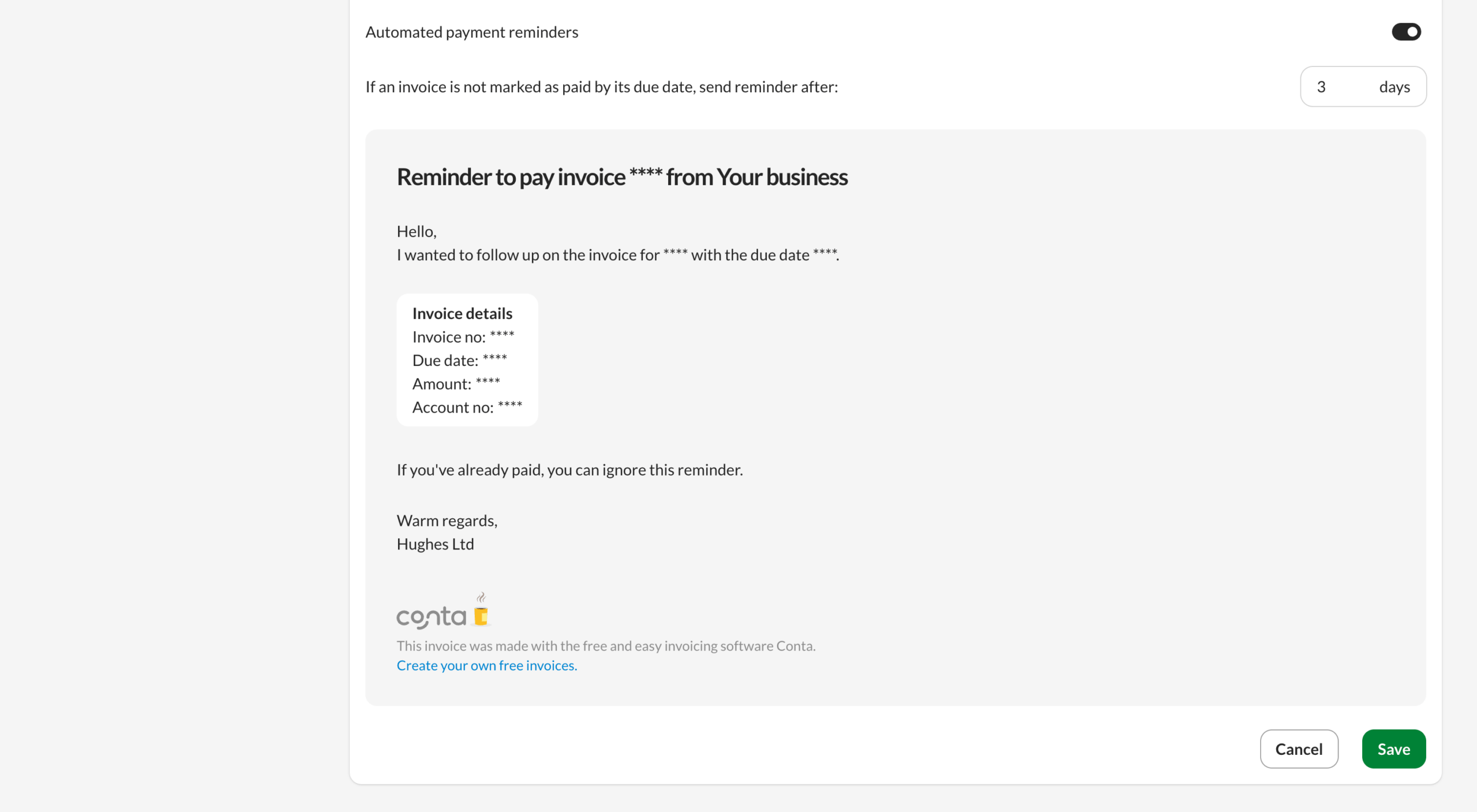 By default, automated reminders are sent 3 days after the due date, but you can easily change this by entering another number. You can see what the reminder will look like on the screen. All the stars will be replaced with the invoice information.